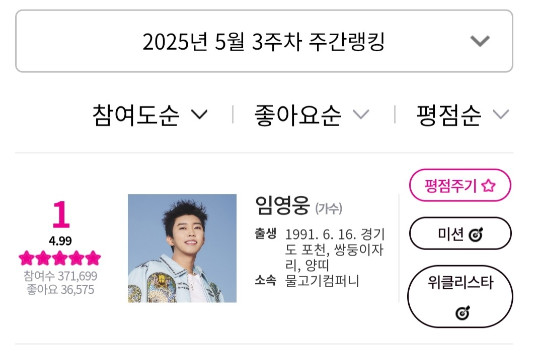 임영웅은 5월 16일부터 5월 22일까지 집계된 5월 3주차 아이돌차트 평점랭킹에서 37만 1699표를 얻어 1위를 차지했다.