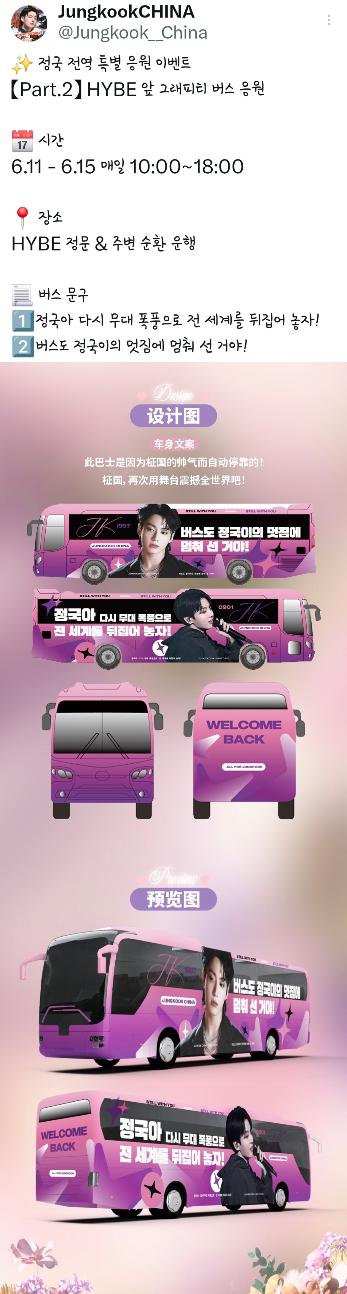 '정국 차이나'에 따르면, 6월 11일~6월 15일 매일 오전 10시~오후 6시까지 방탄소년단 소속사인 하이브 신사옥 정문 및 주변을 순환하는 '정국 버스'를 운행한다.