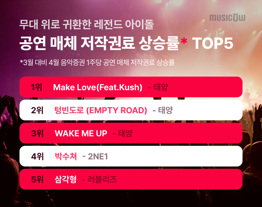 뮤직카우가 공개한 3월 대비 4월 음악증권 1주당 공연 매체 저작권료 상승률이 가장 높은 곡은 태양 'Make Love'로, 1주당 공연 매체 저작권료가 전월 대비 200배 이상 증가해 1,124원을 기록했다. 뒤를 이어 ▲태양 '텅빈도로' ▲태양 'WAKE ME UP' ▲2NE1(투애니원) '박수쳐' ▲러블리즈 '삼각형' 순으로 전월 대비 60~130배의 높은 상승폭을 보였다.
