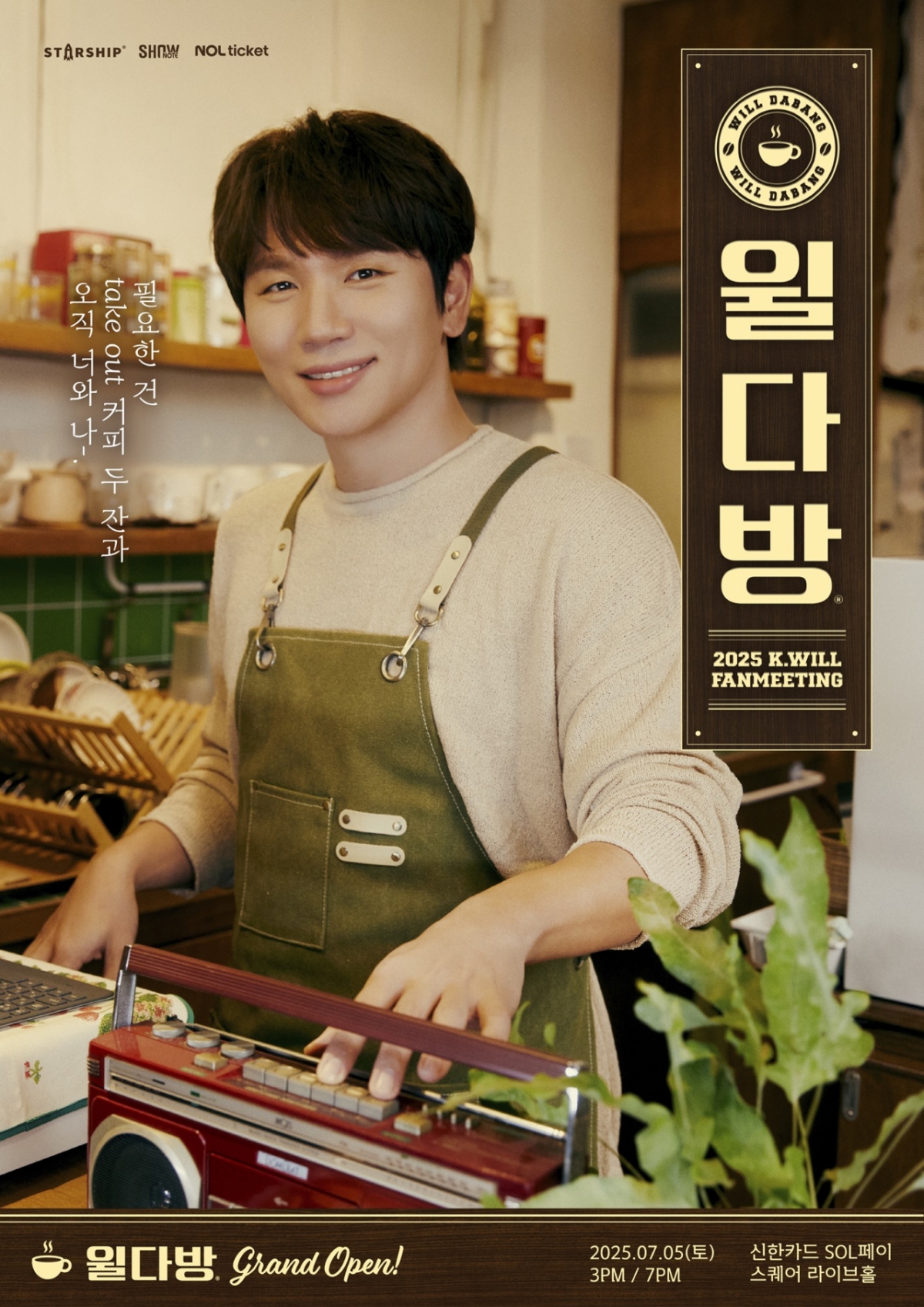 23일 소속사 스타쉽엔터테인먼트는 "케이윌이 7월 5일 오후 3시와 7시, 신한카드 SOL페이스퀘어 라이브홀에서 2025 케이윌 팬미팅 '윌다방'(2025 K.WILL FANMEETING 'WILL DABANG')을 개최한다"고 밝혔다.