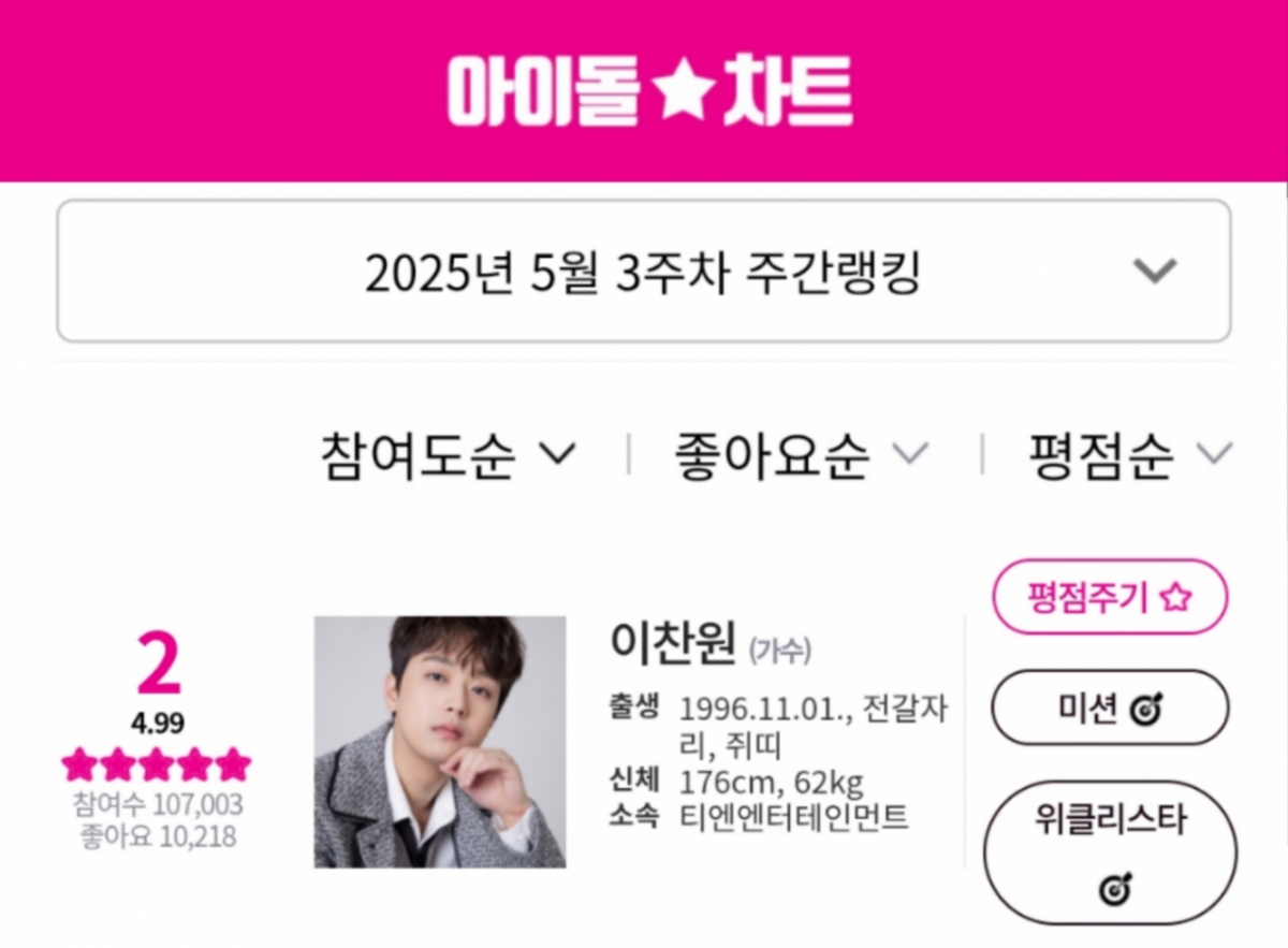 이찬원은 2025년 5월 3주 차 아이돌차트 평점랭킹에서 10만 7003표를 획득, 전체 2위를 차지했다.