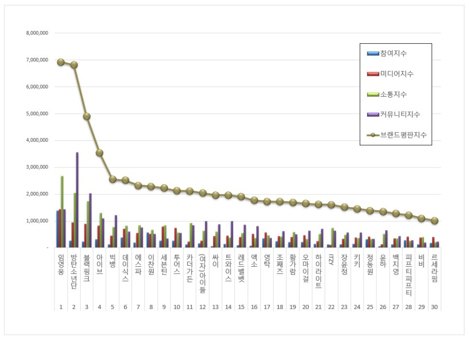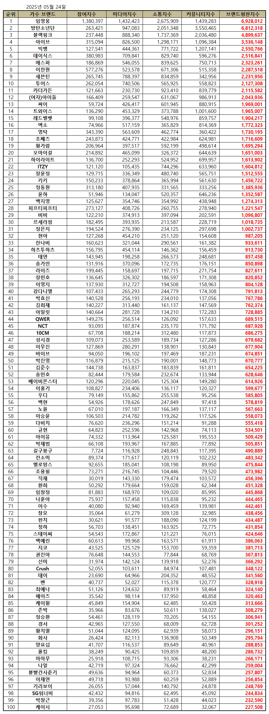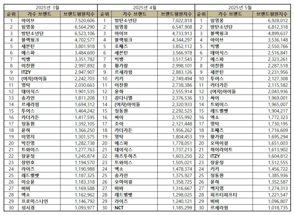 2025년 5월 가수 브랜드평판 30위 순위는 임영웅, 방탄소년단, 블랙핑크, 아이브, 빅뱅, 데이식스, 에스파, 이찬원, 세븐틴, 투어스, 카더가든, (여자)아이들, 싸이, 트와이스, 레드벨벳, 엑소, 영탁, 조째즈, 황가람, 오마이걸, 하이라이트, ITZY, 장윤정, 키키, 정동원, 윤하, 백지영, 피프티피프티, 비비, 르세라핌 순으로 분석됐다.