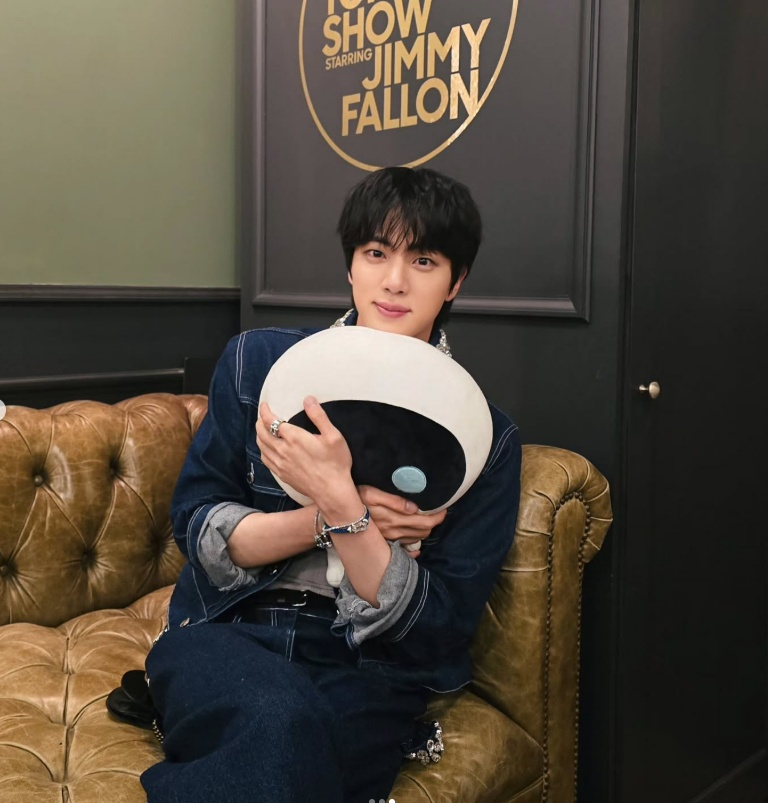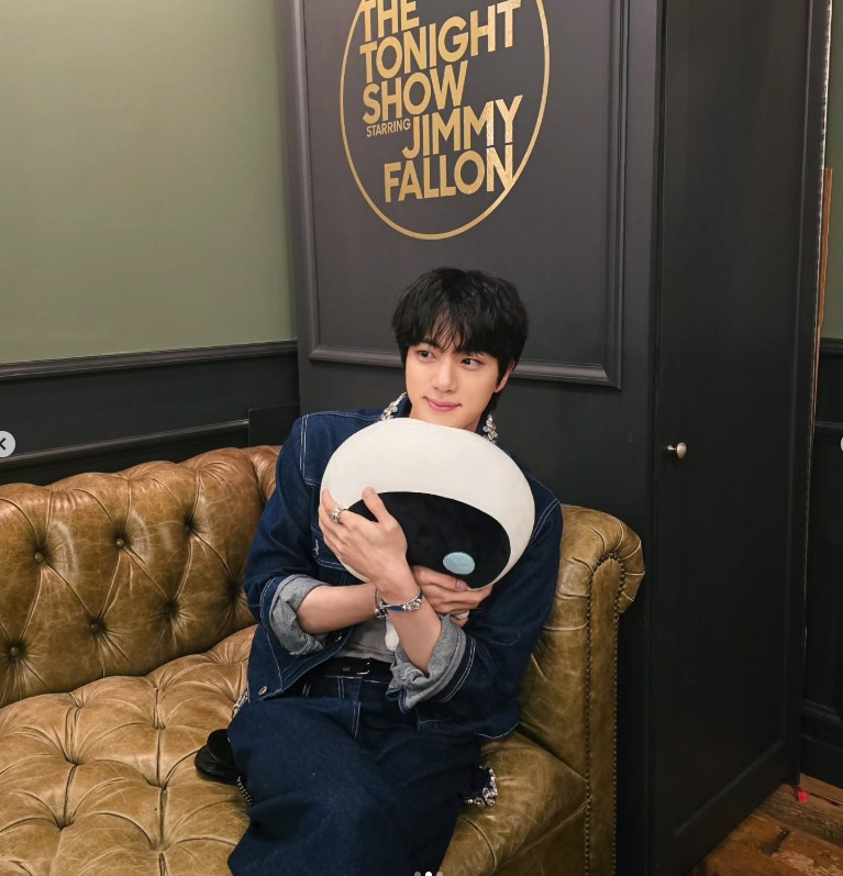 사진 속 진은 청재킷에 청팬츠 차림으로 패셔너블한 모습을 보였다. 그는 '지미 팰런쇼' 대기실 소파에 앉아 인형을 끌어안고 설레는 모습이었다.