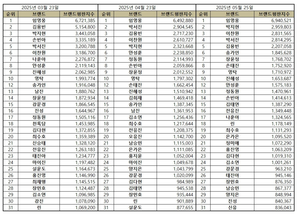 임영웅은 5월 25일 한국기업평판연구소가 발표한 트로트 가수 브랜드평판 2025년 5월 빅데이터 분석결과, 1위를 차지했다. 1위 임영웅에 이어 2위 박지현, 3위 이찬원, 4위 박서진, 5위 김용빈 순으로 분석됐다.
