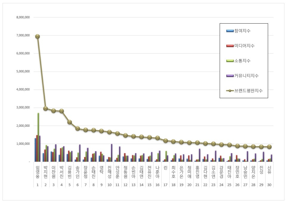 트로트 가수 브랜드평판 1위를 기록한 임영웅 브랜드는 참여지수 1,305,754 미디어지수 1,482,811 소통지수 2,707,972 커뮤니티지수 1,443,984가 되면서 브랜드평판지수 6,940,521로 분석됐다. 지난 4월 브랜드평판지수 6,492,880과 비교해보면 6.89% 상승했다.