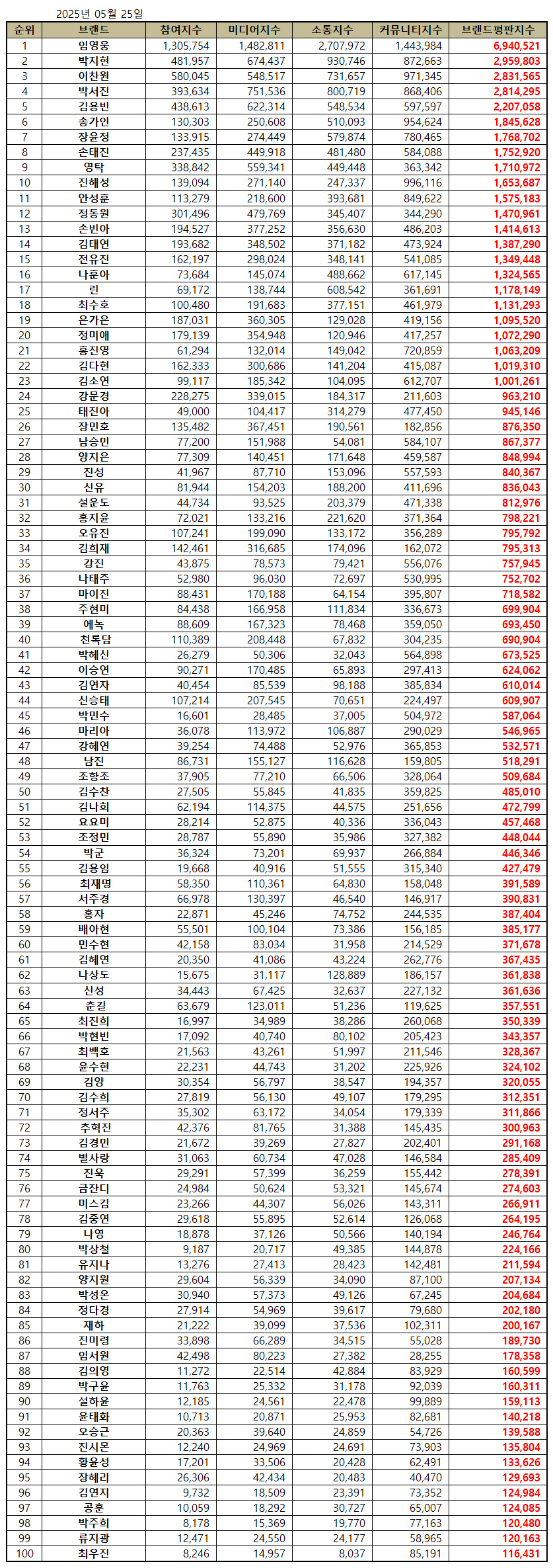 2025년 5월 트로트 가수 브랜드평판 30위 순위는 임영웅, 박지현, 이찬원, 박서진, 김용빈, 송가인, 장윤정, 손태진, 영탁, 진해성, 안성훈, 정동원, 손빈아, 김태연, 전유진, 나훈아, 린, 최수호, 은가은, 정미애, 홍진영, 김다현, 김소연, 강문경, 태진아, 장민호, 남승민, 양지은, 진성, 신유 순으로 분석됐다.