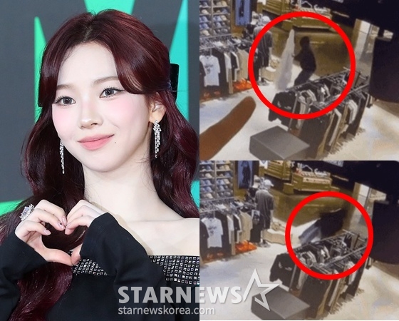 영상에는 한 남성이 검은색 후드티를 입고 MLB 매장에 들어서는 척하더니 매장 앞에 놓인 모델 카리나의 등신대를 갖고 도망가는 모습이 있었다.