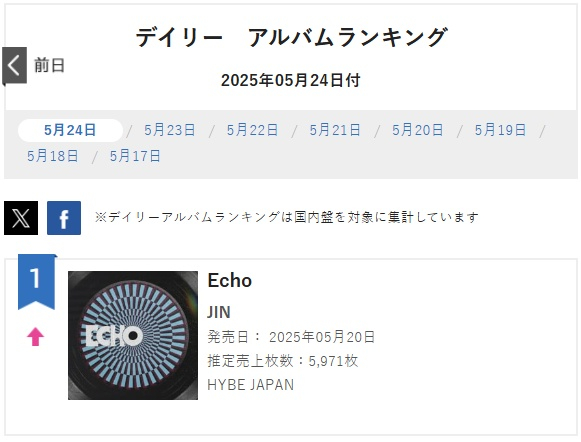한편 25일 발표된 일본 오리콘 데일리 앨범 차트(5월 24일자)에 따르면 진의 '에코'가 1위를 기록했다.
