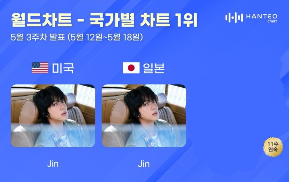 또 지난 23일 한터차트가 발표한 5월 3주 차(집계 기간 12일~18일)에 따르면 진의 2번째 미니 앨범 '에코'는 미국, 일본 국가별 차트 1위에 오르는 등 최고의 인기를 보이고 있다.