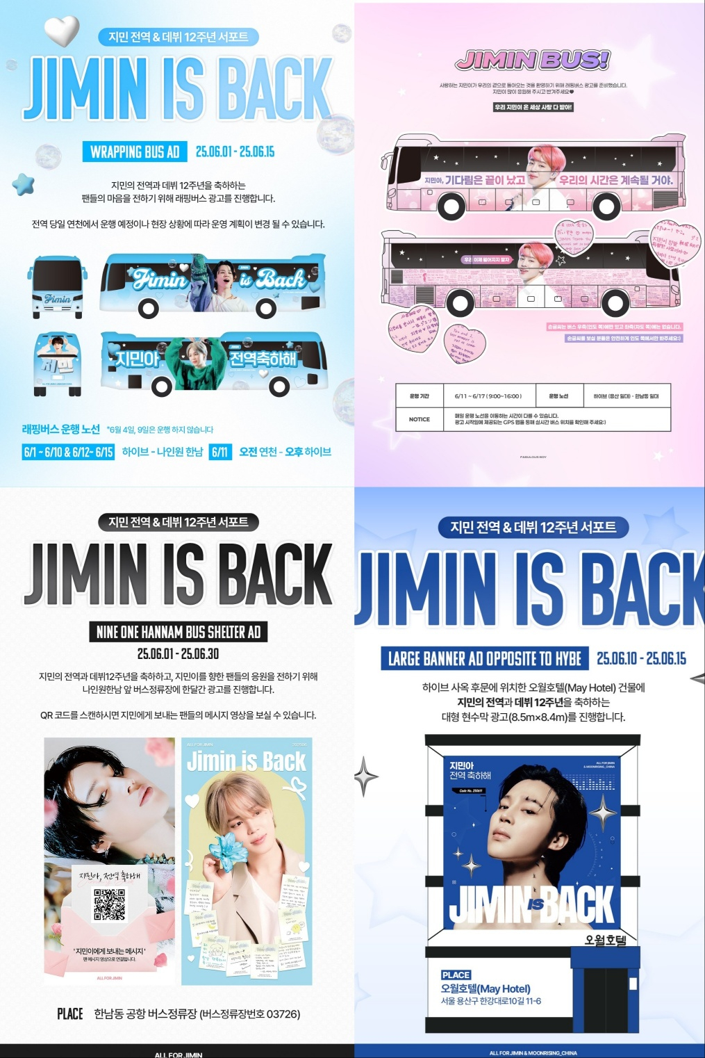 또 '올포지민코리아'와 '지민문라이징'은 하이브 사옥 후문에 위치한 오월 호텔 건물에 8.5미터×8.4미터 사이즈의 대형 현수막을 설치하여 지민의 전역과 데뷔 12주년을 축하할 예정으로 이 광고는 6월 10일부터 15일까지 진행된다.