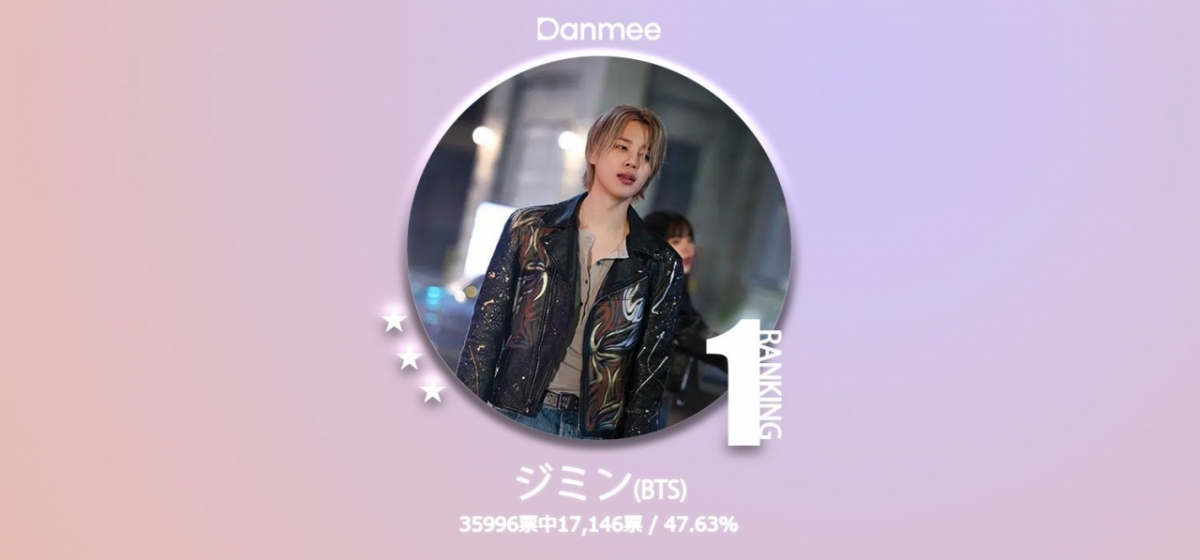 지민은 일본 한류 매체 '단미'(Danmee)에서 5월 13일부터 5월 27일까지 실시한 '왕의 증거는 누구의 손에!? 5월 K팝 남자 아이돌 인기 결정전' 설문조사에서 1위를 차지했다.