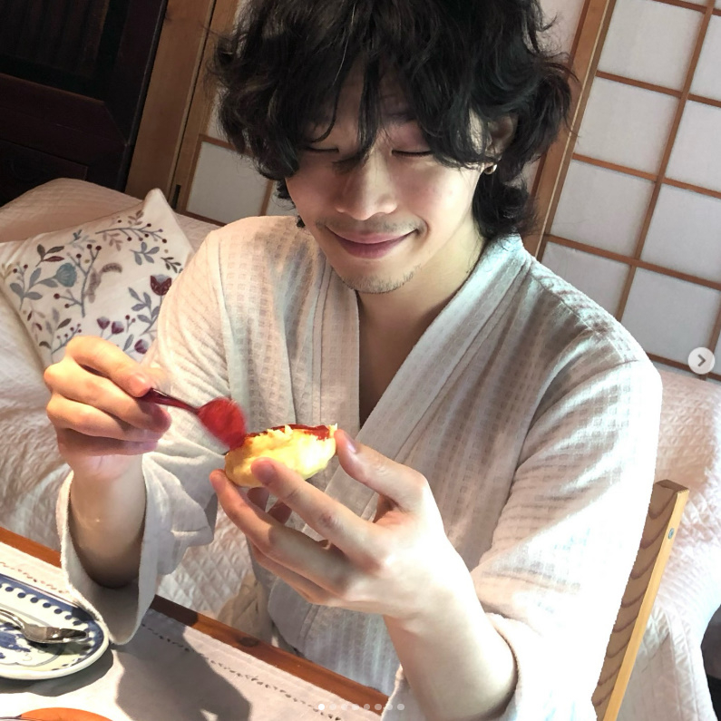 사진 속 이찬혁은 가운을 입고 빵에 잼을 발라먹고 있는 모습. 장발 수준의 긴 파마 머리에 수염을 깎지 않은 채 자유롭게 여유를 즐기고 있는 모습이다.
