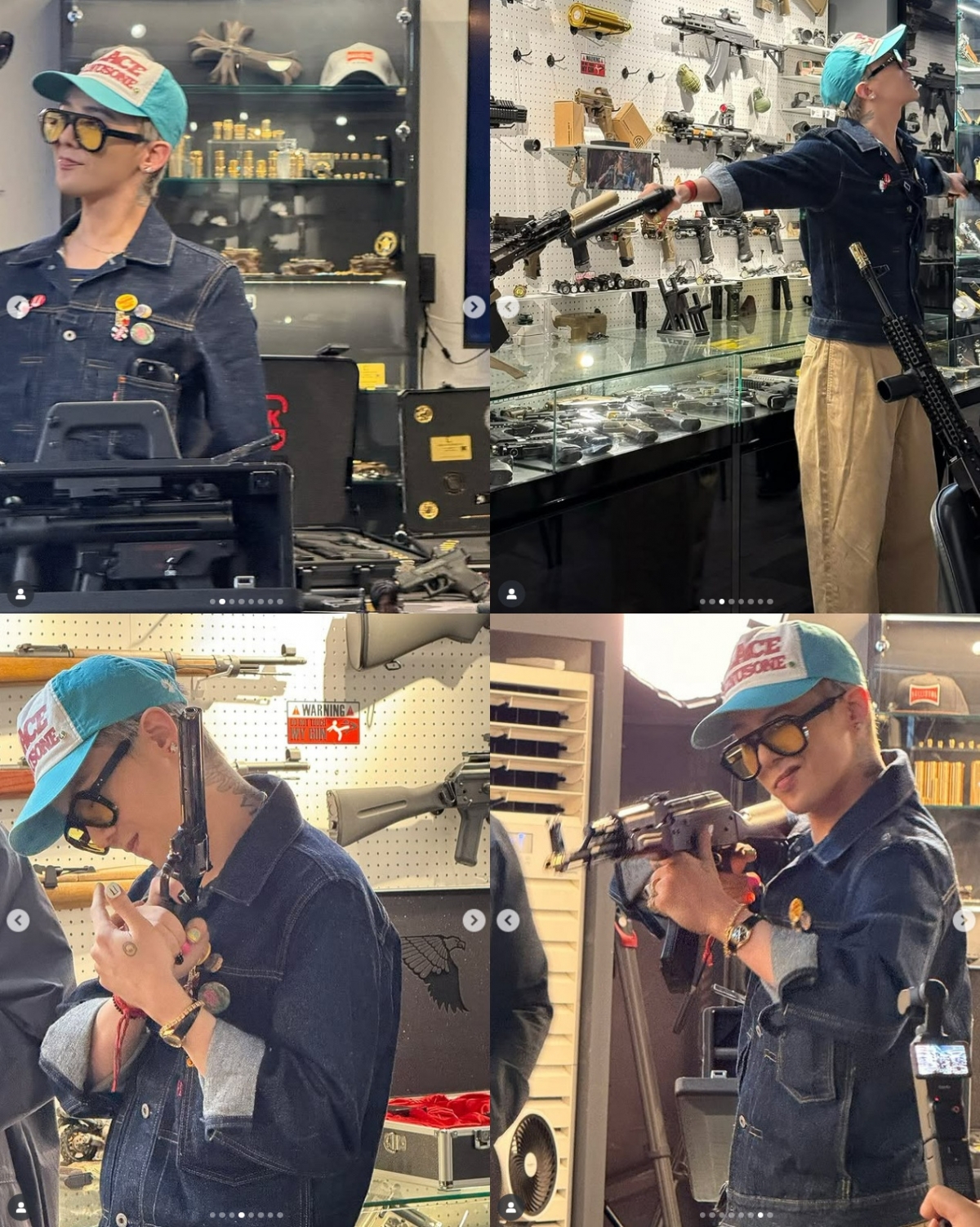 사진 속 지드래곤은 한 총 매장에서 민소매를 입은 채 겨드랑이를 만지고 있는 모습. 지드래곤은 총 매장에 온 만큼 팔 상단에 권총 모양의 타투를 자랑하며 장전을 하고 있는 뉘앙스를 풍겼다. 또한 그는 총을 들고 다양한 포즈를 취하며 남다른 포스를 뽐냈다.