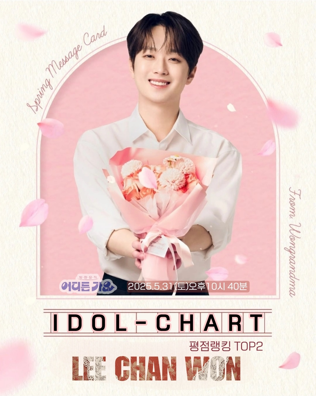 이찬원은 2025년 5월 4주 차 아이돌차트 평점랭킹에서 10만 8044표를 획득, 전체 2위를 차지했다.