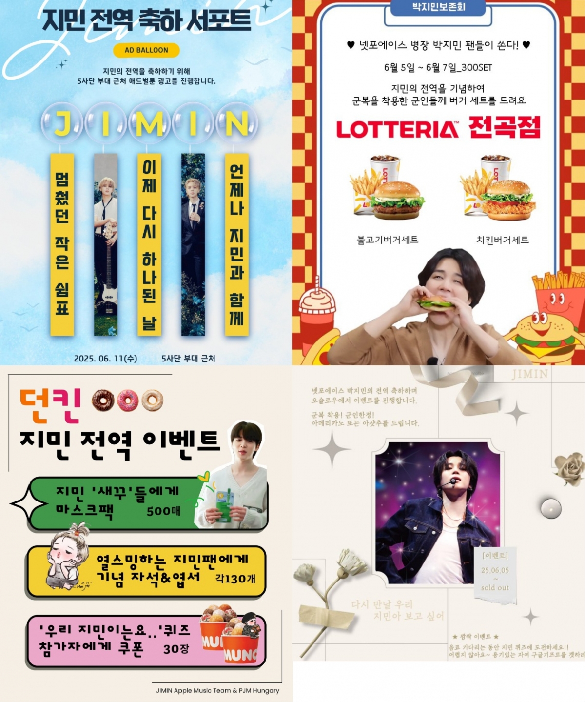 '지민데이터' 팀은 지민을 따뜻하게 맞이하며 팬들의 사랑을 전하기 위해 군부대 앞에 진심 어린 메시지가 담긴 현수막 15개를 준비했다. 또 '지민 애플뮤직팀'과 'PJM 헝가리'는 6월 6일부터 11일까지 군복입은 군인에게 마스크팩 500매 증정, 전역기념 자석 및 엽서 증정하고 지민 퀴즈 이벤트 정답자에게 던킨도너츠 쿠폰을 증정한다.