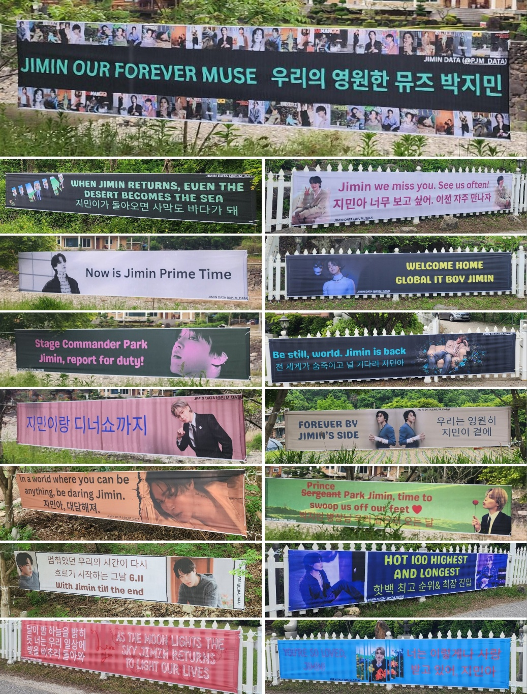 또 다른 지민 팬연합 '지민 애플뮤직팀'은 전 세계 지민 팬들의 열렬한 요청으로 팬들이 직접 디자인한 현수막 35개를 부대 인근에 5월 28일부터 6월 11일까지 추가 설치하는 등 지민의 전역을 기다리는 팬들의 뜨거운 마음을 담은 다양한 이벤트로 설렘을 더하고 있다.