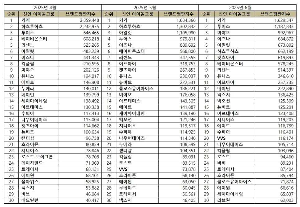 2025년 6월 신인 아이돌그룹 브랜드평판 30위 순위는 키키, 투어스, 미야오, 이즈나, 아일릿 , 하츠투하츠, 캣츠아이, 베이비몬스터, 리센느, 유니스, 이프아이, 메이딘, 넥스지, 빅오션, 뉴비트, 아르테미스, 지니어스, 에이트, 수피아, VVS, 나우어데이즈, 킥플립, 로스트, 버비, 트레이서, 호라이즌, 클로즈유어아이즈, 에이원, 세이마이네임, 러브원 순으로 분석됐다.