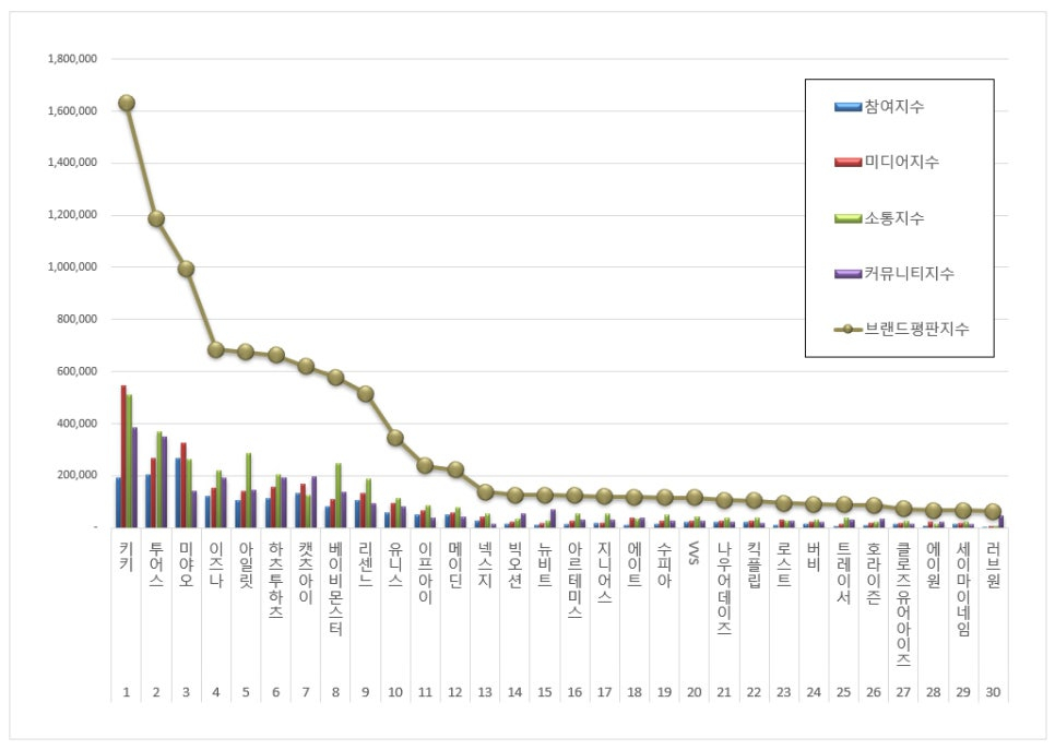 신인 아이돌그룹 1위를 기록한 키키 ( 지유, 이솔, 수이, 하음, 키야 ) 브랜드는 참여지수 190,936 미디어지수 545,970 소통지수 510,170 커뮤니티지수 382,471이 되면서 브랜드평판지수 1,629,547로 분석됐다. 지난 5월 브랜드평판지수 1,634,366과 비교해보면 0.29% 하락했다.