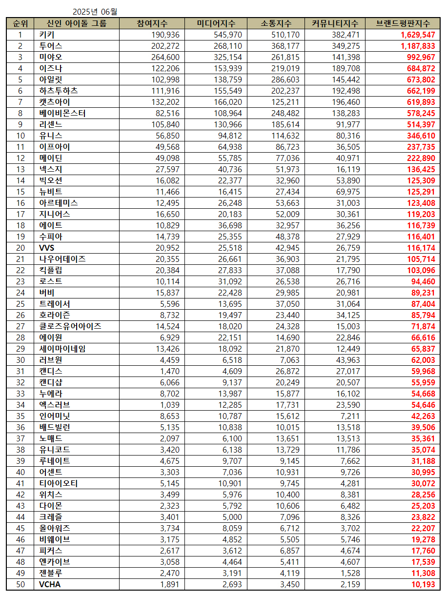 신인 아이돌그룹 브랜드평판 2025년 6월 분석에서는 키키, 투어스, 미야오, 이즈나, 아일릿 , 하츠투하츠, 캣츠아이, 베이비몬스터, 리센느, 유니스, 이프아이, 메이딘, 넥스지, 빅오션, 뉴비트, 아르테미스, 지니어스, 에이트, 수피아, VVS, 나우어데이즈, 킥플립, 로스트, 버비, 트레이서, 호라이즌, 클로즈유어아이즈, 에이원, 세이마이네임, 러브원, 캔디스, 캔디샵, 누에라, 엑스러브, 인어미닛, 배드빌런, 노매드, 유니코드, 루네이트, 어센트, 티아이오티, 위치스, 다이몬, 크레즐, 올아워즈, 비웨이브, 피커스, 엔카이브, 젠블루, VCHA를 분석했다.