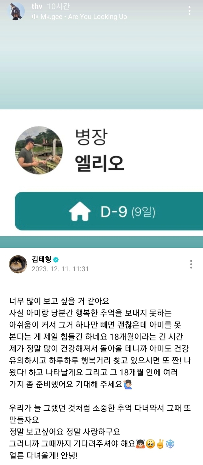 "전역 9일 전, 준비됐어 태형아?"라는 팬의 글에는 "네! 뭐 할래, 뭐 할까?"라며 팬들과 만날 생각에 들뜬 마음을 드러냈다.