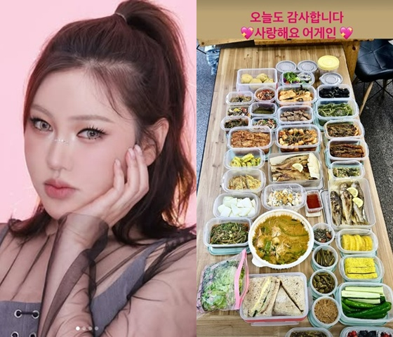사진에는 송가인이 팬클럽 '어게인'으로부터 받은 수많은 밥 반찬이 한 상 가득 차려져 있었다.