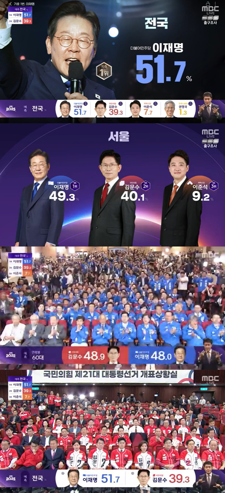 3일 오후 11시 40분경 MBC는 개표 통계 프로그램 '적중 2025'에 따라 이재명 후보가 48.9%로 득표율 1위임을 알렸고 "당선 확실"을 발표했다.