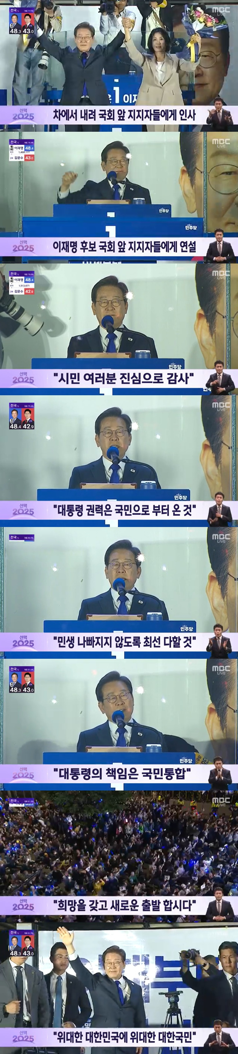 이재명 후보는 "존경하는 대한민국 국민 여러분, 아직은 당선자로 확정되지 못했지만 제21대 대통령으로 당선될 확률이 꽤 높은 이재명 인사드립니다"라며 인사했다. 그는 "민주공화국 대한민국 시민 여러분, 진심으로 감사드린다. 여러분들이 제게 기대하시고 맡긴 사명을 한 순간도 잊지 않고 한치도 어긋남 없이 확실히 이행하겠다"라고 말했다.
