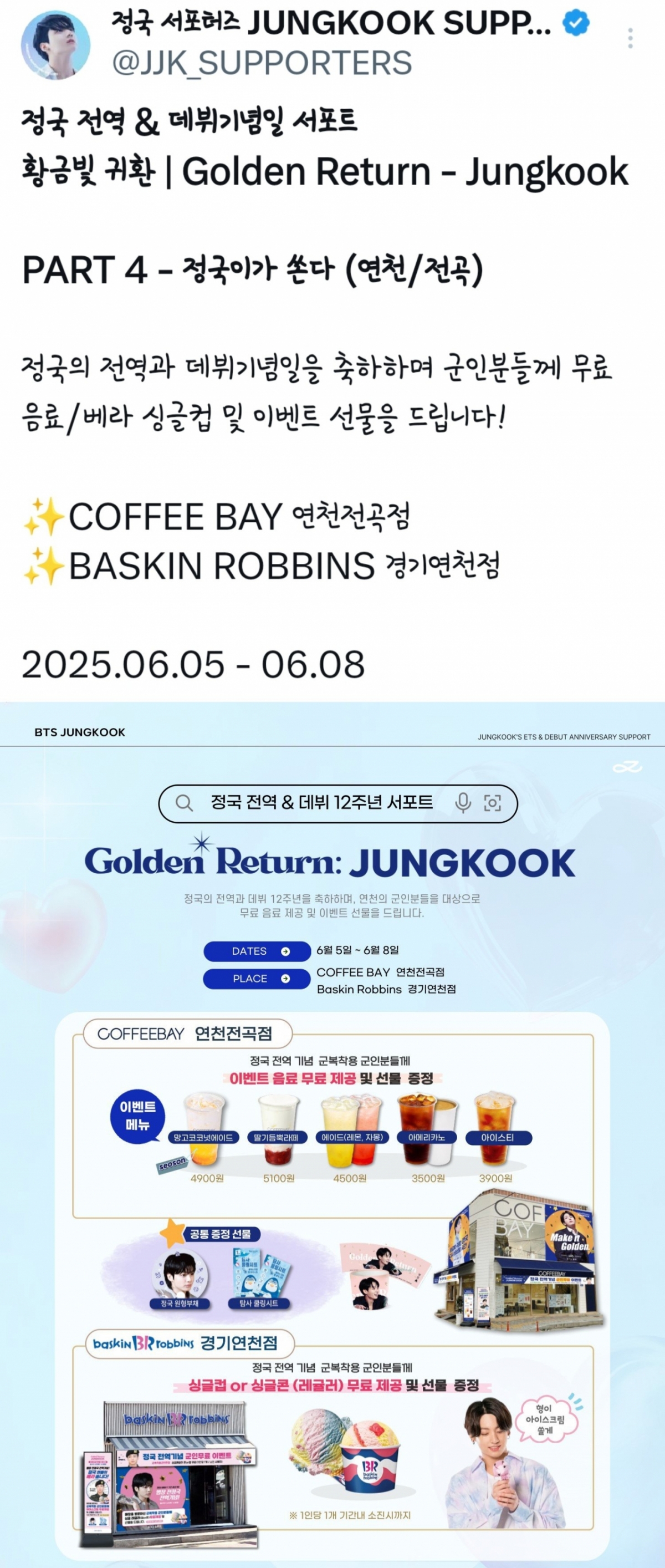 '정국 서포터즈'는 정국이 군복무 중인 경기도 연천에 위치한 커피베이 연천전곡점, 베스킨라빈스 경기연천점에서 군복을 착용한 군인들에게 무료 음료와 아이스크림 제공하여 그의 군 전역과 데뷔 기념일을 더욱 뜻 깊은 날로 장식할 예정이다.