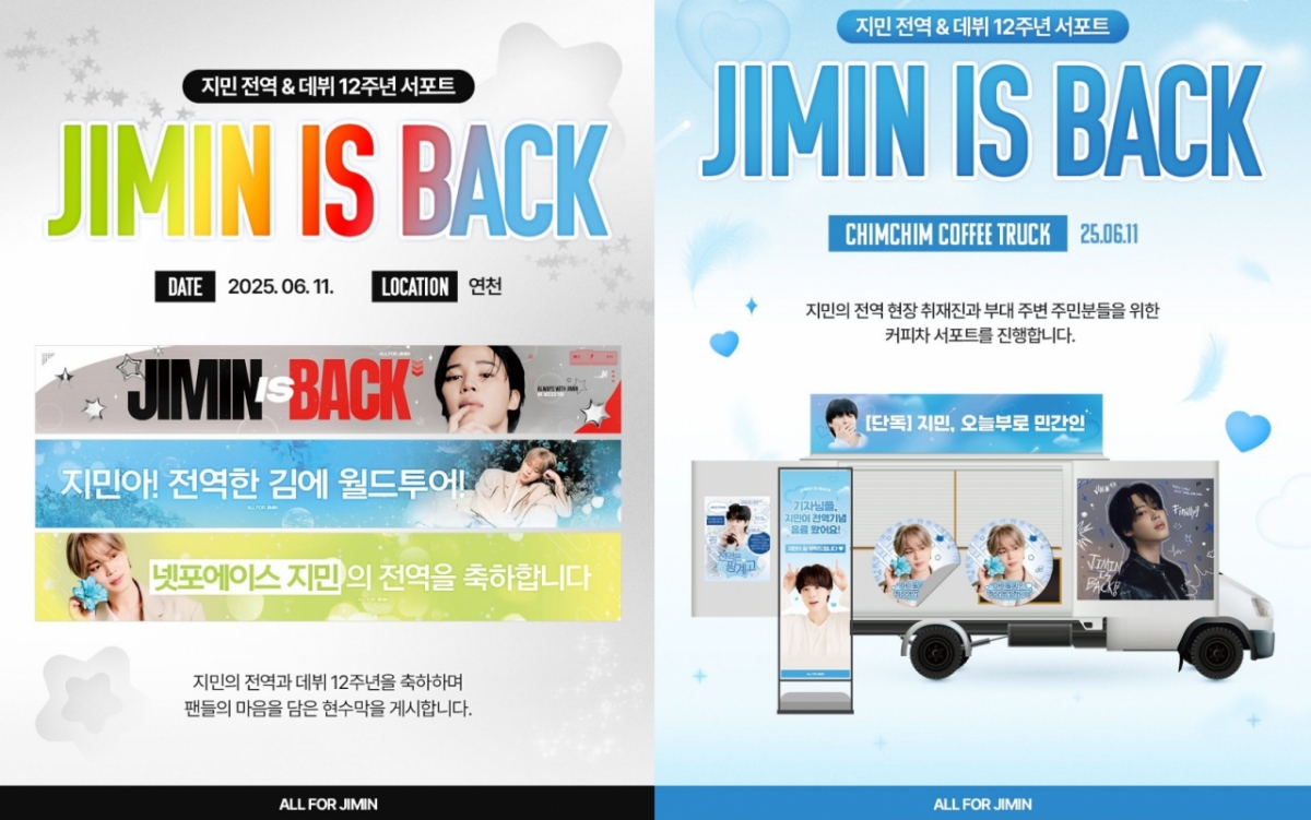 지민의 전역 당일인 6월 11일에는 지민이 복무한 연천 지역에 팬들의 마음을 담은 현수막을 걸고 부대 주변 주민들과 전역 현장 취재진들을 대접하기 위한 커피차 이벤트도 함께 진행해 따뜻한 배려심 돋보이는 기획으로 더욱 열띤 반응을 얻고 있다.