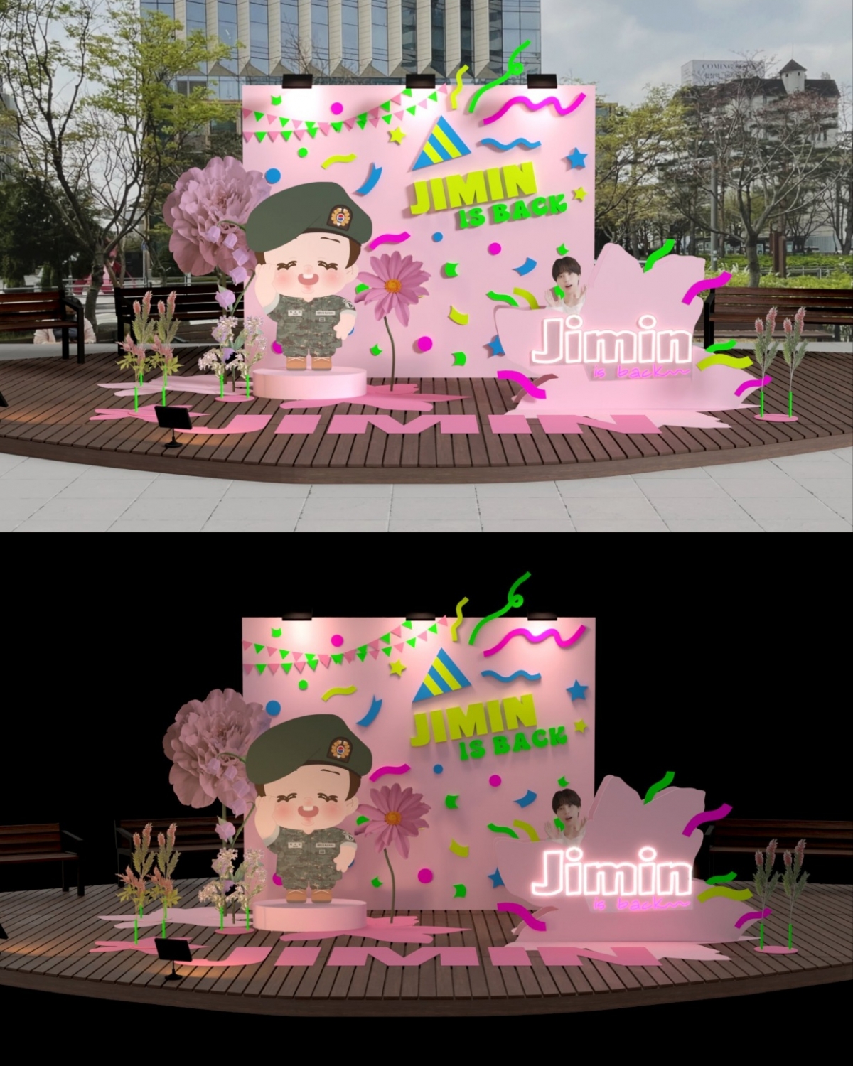 이번 서포트는 6월 11일부터 15일까지 소속사 하이브 사옥 옆 공원에서 진행되며 군복을 입은 지민의 모습을 캐릭터화 한 조형물을 설치하고 초록의 녹음과 어우러지는 꽃과 핑크색 배경으로 지민의 전역을 기다리는 팬들의 마음을 설레게 하고 있다.