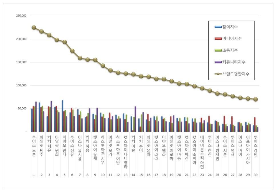 2위, 아일릿 민주 브랜드는 참여지수 63,459 미디어지수 52,332 소통지수 56,065 커뮤니티지수 44,761이 되면서 브랜드평판지수 216,617로 분석됐다.