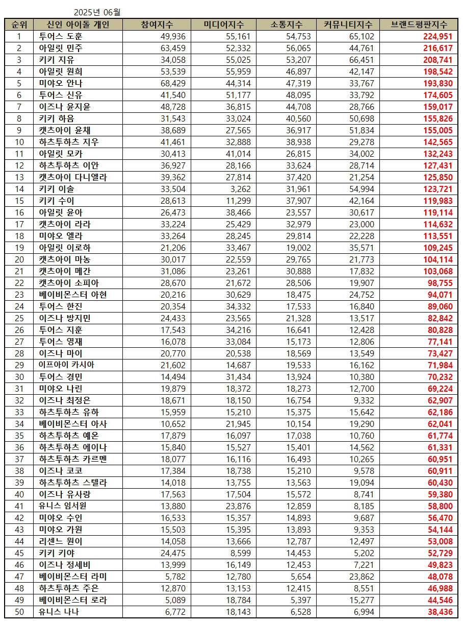 신인 아이돌 개인 브랜드평판 2025년 6월 분석에서는 투어스 도훈, 아일릿 민주, 키키 지유, 아일릿 원희, 미야오 안나, 투어스 신유, 이즈나 윤지윤, 키키 하음, 캣츠아이 윤채, 하츠투하츠 지우, 아일릿 모카, 하츠투하츠 이안, 캣츠아이 다니엘라, 키키 이솔, 키키 수이, 아일릿 윤아, 캣츠아이 라라, 미야오 엘라, 아일릿 이로하, 캣츠아이 마농, 캣츠아이 메간, 캣츠아이 소피아, 베이비몬스터 아현, 투어스 한진, 이즈나 방지민, 투어스 지훈, 투어스 영재, 이즈나 마이, 이프아이 카시아, 투어스 경민, 미야오 나린, 이즈나 최정은, 하츠투하츠 유하, 베이비몬스터 아사, 하츠투하츠 예온, 하츠투하츠 에이나, 하츠투하츠 카르멘, 이즈나 코코, 하츠투하츠 스텔라, 이즈나 유사랑, 유니스 임서원, 미야오 수인, 미야오 가원, 리센느 원이, 키키 키야, 이즈나 정세비, 베이비몬스터 라미, 하츠투하츠 주은, 베이비몬스터 로라, 유니스 나나를 분석했다.