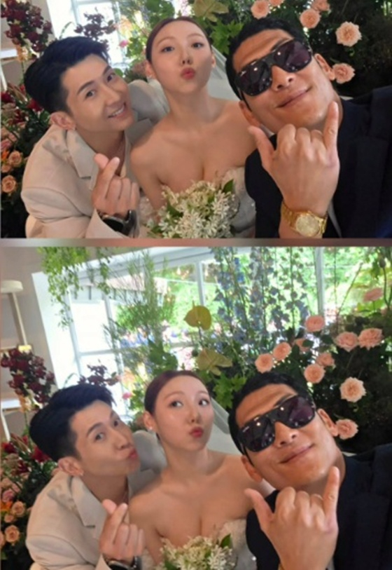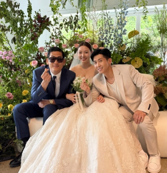 공개된 사진 속 브라이언은 그룹 god 멤버 박준형과 함께 신부 민과 셀카 찍는 모습을 담았다. 순백의 드레스를 입은 민은 아름다운 미모를 자랑했다. 특히 그의 옆에 나란히 선 훈훈한 비주얼의 남편이 공개돼 눈길을 끌었다.