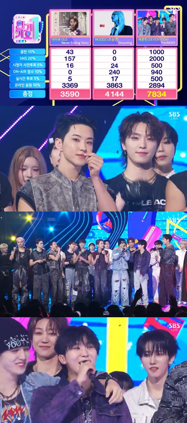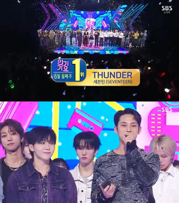 8일 오후 방송된 SBS 음악 프로그램 '인기가요'에서는 세븐틴이 1위를 차지했다. 이날 6월 2주차 1위 후보로 아이유 'Never Ending Story', 우즈(조승연) 'Drowning', 세븐틴 'THUNDER'가 올랐다.
