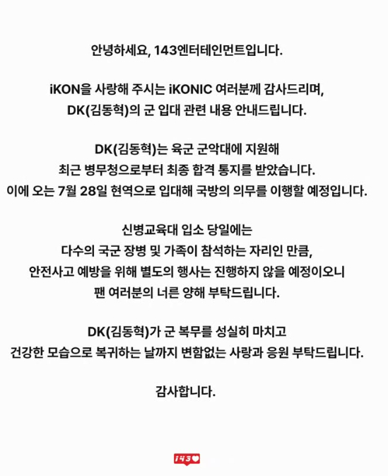 연예K-POP아이콘 동혁, 7월 28일 현역 입대.."군악대 최종 합격"[공식][전문]발행 : 2025.06.09 ・ 10:11윤상근 기자/사진=동혁 SNS아이돌그룹 아이콘 멤버 동혁(DK)이 군악대로 현역 복무한다.소속사 143엔터테인먼트는 9일 "DK가 육군 군악대에 지원해 최근 병무청으로부터 합격 통지를 받았다"라고 밝혔다.이와 함께 DK는 오는 7월 28일 현역으로 입대, 군 생활을 시작할 계획이다.◆ 143엔터테인먼트 공식입장 전문/사진제공=143엔터테인먼트<저작권자 © 스타뉴스, 무단전재 및 재배포 금지>AAA아이콘동혁DK입대군악대추천 기사윤상근 기자기자홈좋아요 연예-K-POP의 인기 급상승 뉴스연예-K-POP의 최신 뉴스