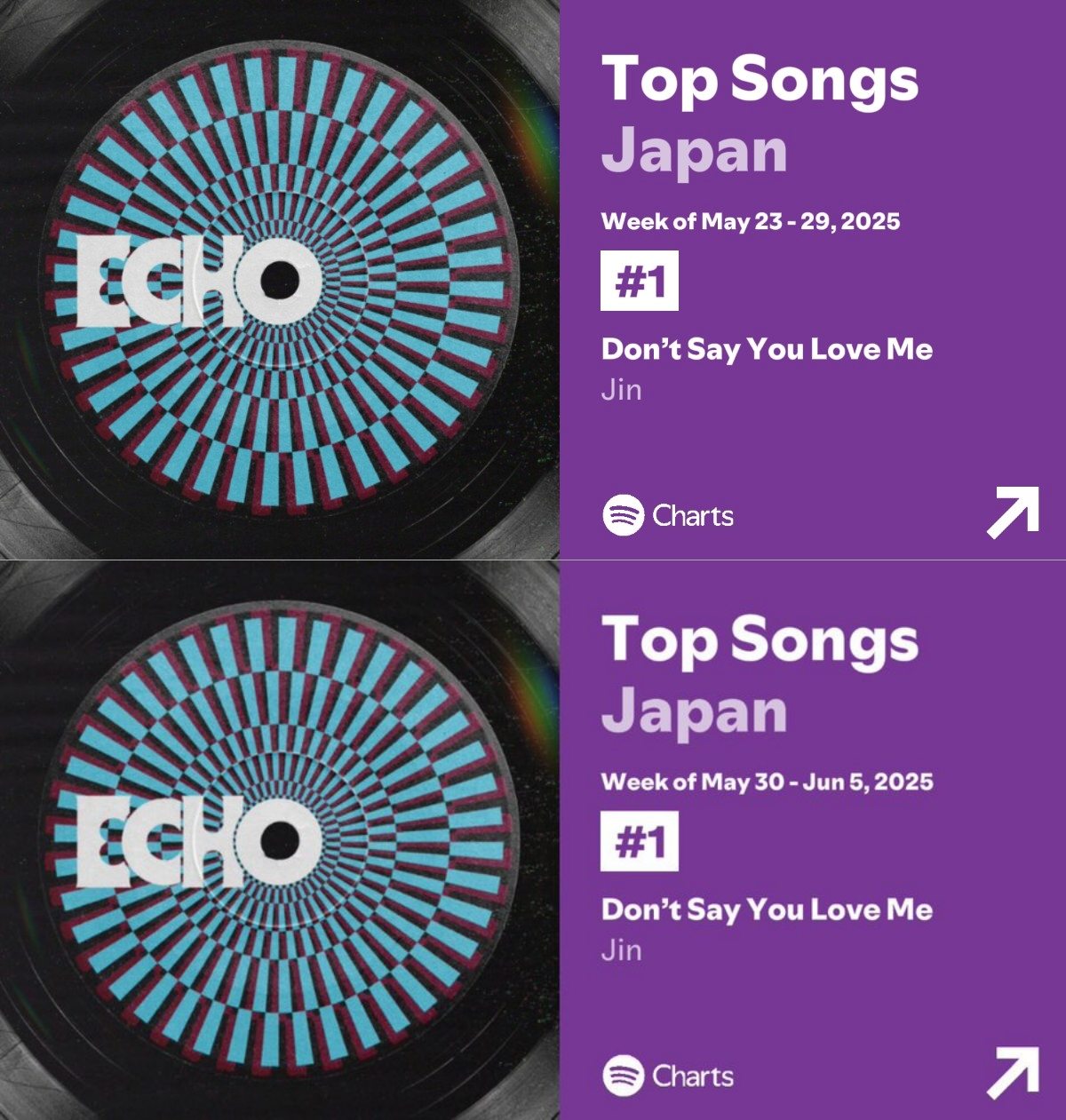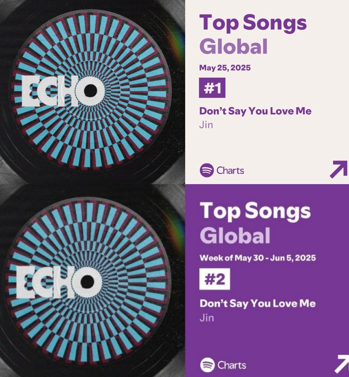 지난 5월 16일(한국 시간) 발매된 진의 솔로 미니 2집 '에코'(Echo)의 타이틀곡 '돈 세이 유 러브 미'(Don't Say You Love Me)는 지난 9일 발표된 세계 최대 음원 플랫폼 스포티파이(Spotify) 한국에서 1위(6월 8일자)를 차지하며 최고의 인기를 보였다. 진은 톱 아티스트 한국 순위도 1위를 기록했다. '돈 세이 유 러브 미'는 이날 글로벌(전 세계) 스포티파이에서는 3위를 기록했다.