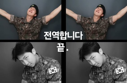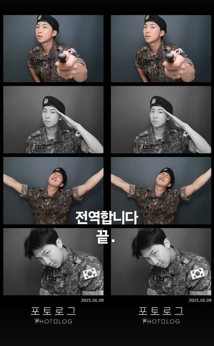 방탄소년단 멤버 RM은 지난 9일 자신의 인스타그램에 "전역합니다 끝."이란 글과 함께 네 컷 사진을 선보였다.