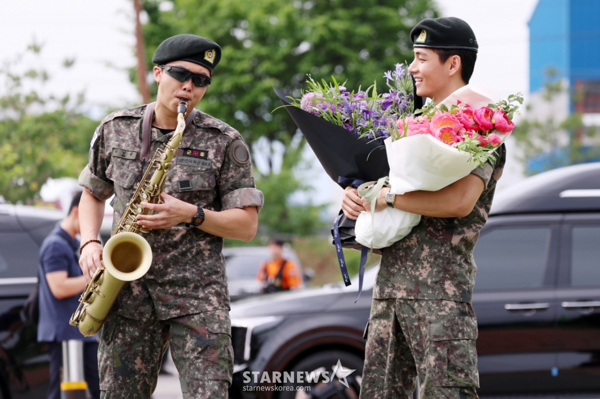RM과 뷔는 같은 날 오전 소속 부대에서 각자 전역 신고를 마친 뒤 위병소를 나왔다. 두 사람은 지난 2023년 12월 육군 현역으로 입대해 각각 15사단 군악대와 2군단 군사경찰 특수임무대에서 복무했다.