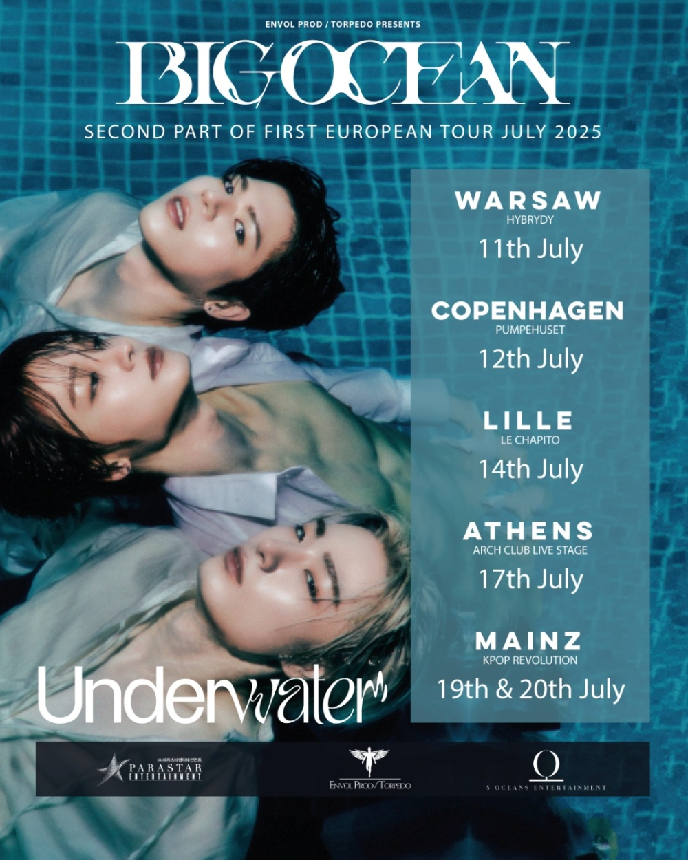 10일, 소속사 파라스타엔터테인먼트는 빅오션(찬연, PJ, 지석)의 2차 유럽 투어 'Underwater'(언더워터) 포스터를 공개하며 오는 7월 11일 폴란드 바르샤바, 12일 덴마크 코펜하겐, 14일 프랑스 릴, 17일 그리스 아테네, 19일 독일 마인츠에서 공연이 추가로 개최된다는 소식을 알렸다.