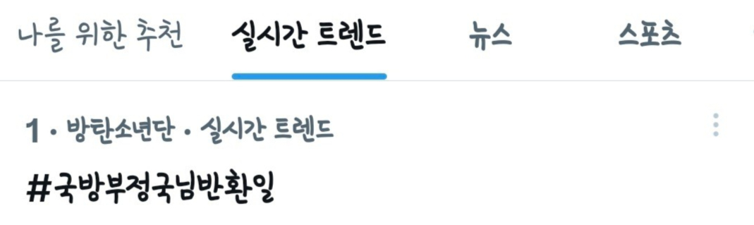 그로부터 28분 후 '#국방부정국님반환일'이 실시간 트렌드 1위를 순식간에 차지했다.