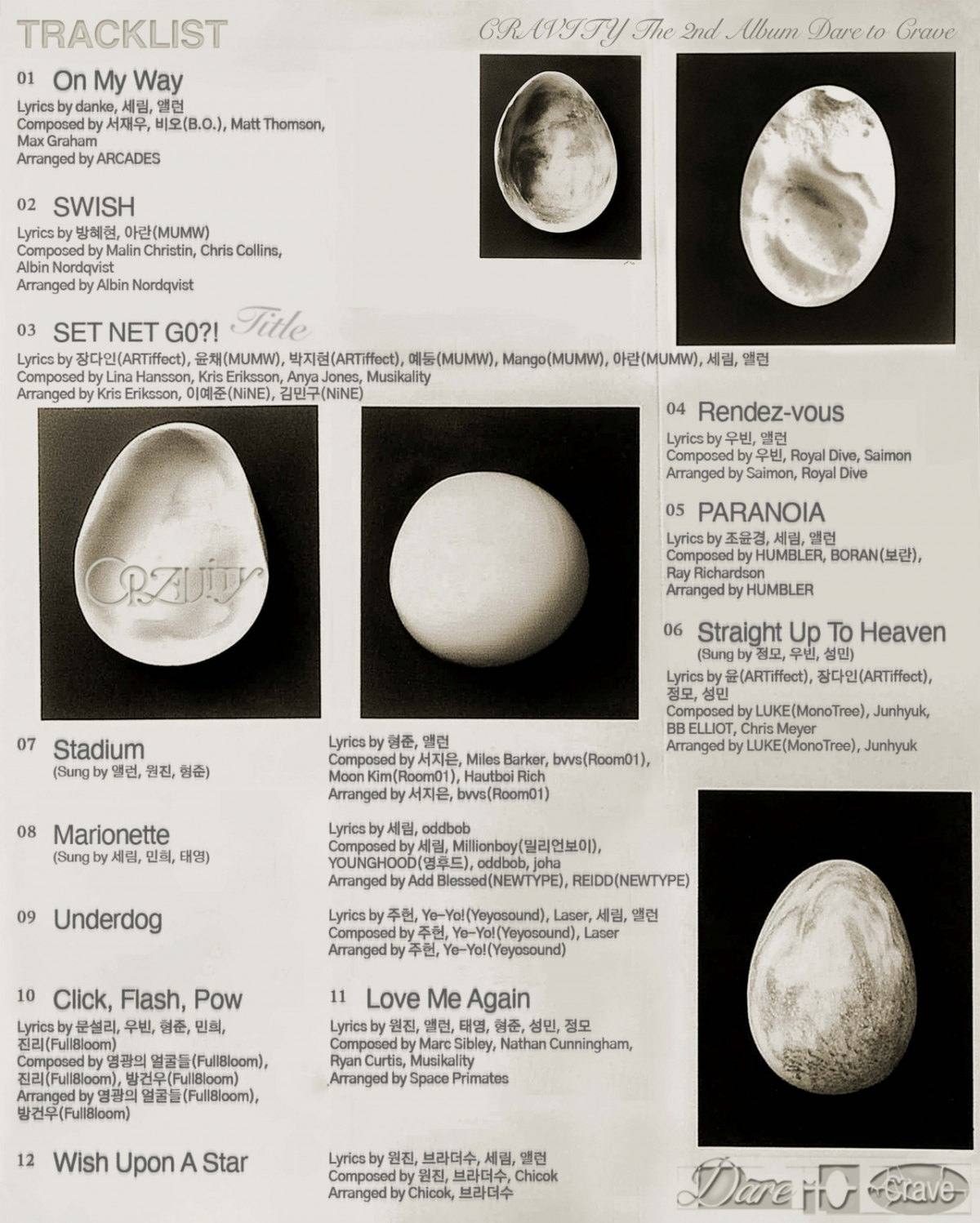 소속사 스타쉽엔터테인먼트는 지난 10일 크래비티 공식 SNS를 통해 크래비티의 두 번째 정규 앨범 '데어 투 크레이브(Dare to Crave)'의 트랙리스트를 공개했다.