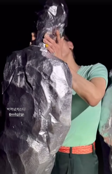 사진에서 지드래곤은 사람의 형상을 한 은빛 오브제에 키스하는 듯한 가짜 연출을 해 웃음을 자아냈다.