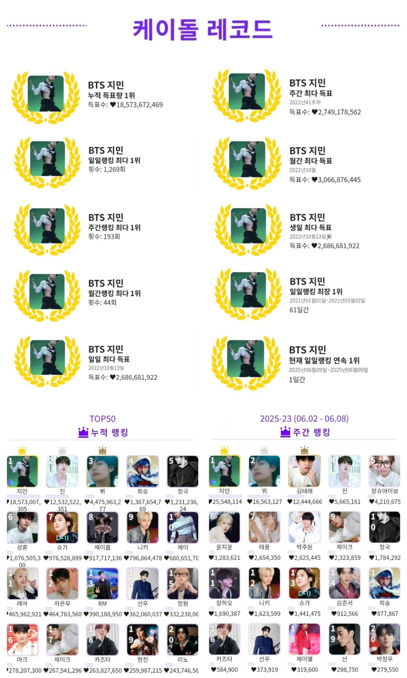 지민은 글로벌 K팝 아이돌 인기투표 '케이돌(KDOL)' 6월 첫째주(2025년 6월 2일 - 2025년 6월 8일) 주간랭킹에서 2554만 8114개의 하트를 받아 1위를 차지하며 총 193회째 주간랭킹 1위를 기록했다.