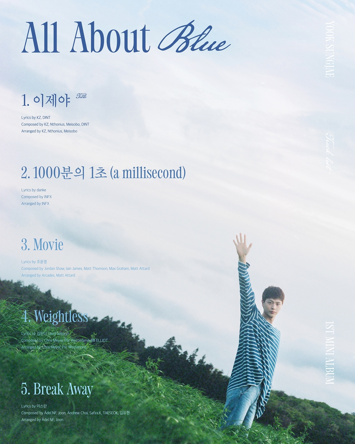 이날 공개된 트랙리스트 이미지는 청량한 들판 한 가운데 서 있는 육성재의 모습이 담겨있다. 그는 스트라이프 티셔츠와 청바지를 입고 인사하듯 자연스럽게 한 손을 들고 있다. 청춘 영화 포스터 같은 분위기는 신보에 대한 호기심을 자극했다.