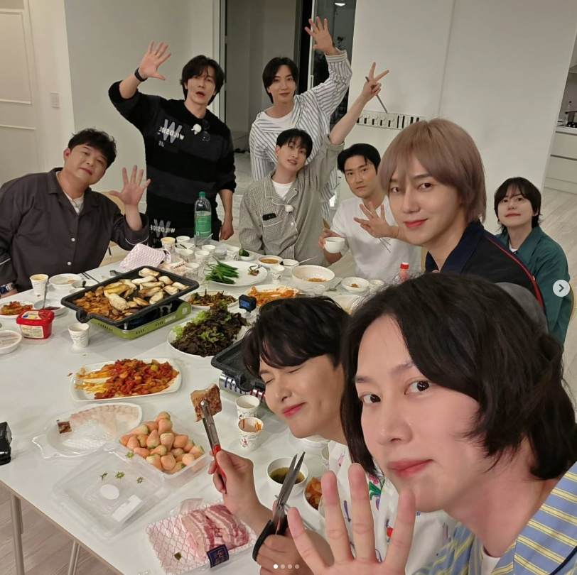 사진 속에는 김희철이 슈퍼주니어 이특, 예성, 신동, 은혁, 동해, 시원, 려욱, 규현과 모여 데뷔 20주년을 자축하는 모습이 있었다. 이들은 파자마 차림으로 삼겹살 파티를 하는 모습으로 친근함을 전했다.