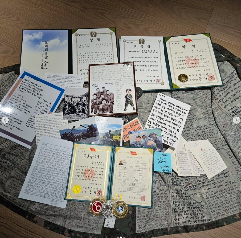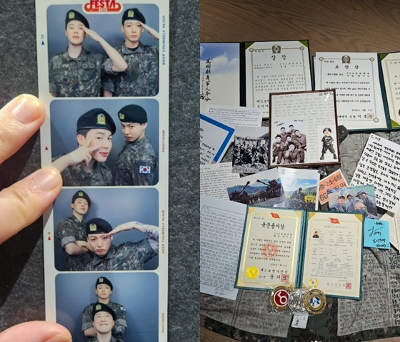 지민은 '표창장', '육군용사상' 등 군 생활을 하며 받은 각종 상장과 전우들과 함께한 사진, 전우들에게 받은 편지 등을 공개하며 애틋함을 전했다.