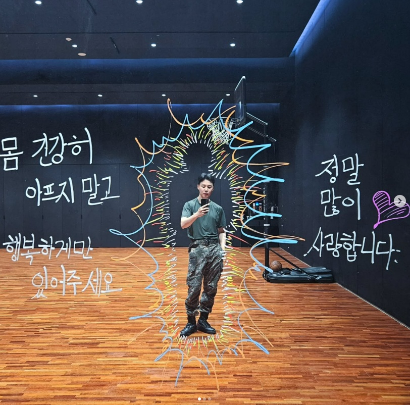 사진 속 지민은 군복을 입고 하이브 연습실 거울 앞에서 셀카를 촬영, "몸 건강히 아프지 말고 행복하게만 있어주세요. 정말 많이 사랑합니다"라고 전우들에게 메시지를 남겼다.