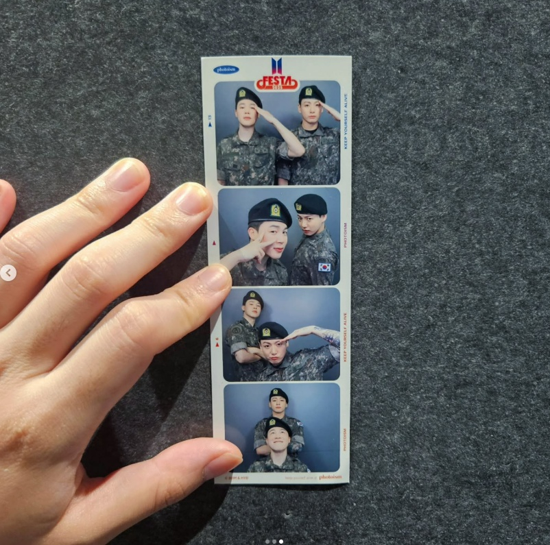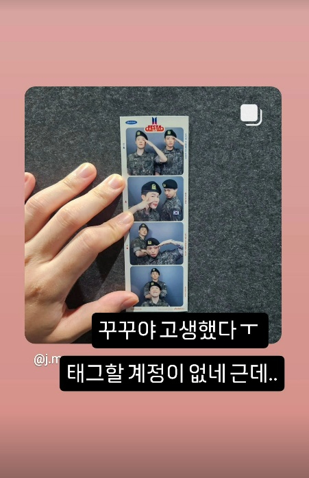 지민은 지난 2023년 12월 12일 동반 입대하고 육군 제5보병사단에서 함께 복무를 한 정국과의 '군복 네 컷'도 공개했다. 이와 함께 그는 "꾸꾸야 고생했다. 근데 태그할 계정이 없네"라고 덧붙여 웃음을 자아냈다.