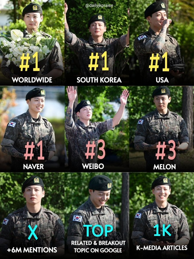 정국은 11일 지민과 함께 18개월간의 육군 5사단 포병여단 복무를 마치고 전역한 후, 몇 시간 만에 각종 온라인 플랫폼을 석권했다. 한국 구글 트렌드에서 1위를 차지하며 검색량이 300% 급증했고, X(구 트위터)에서만 전 세계적으로 830만 건의 참여(좋아요, 리트윗, 댓글 등)를 기록했다. 또한 미국 구글 최다 검색 주제가 되었고, 글로벌 X 트렌드 1위에 오르는 등 압도적인 온라인 영향력을 보여줬다.