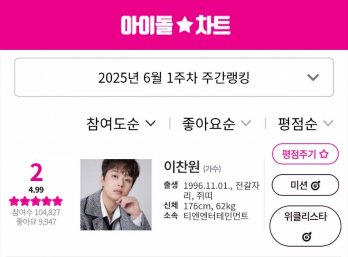 이찬원은 2025년 6월 1주 차 아이돌차트 평점랭킹에서 10만 4827표를 획득, 전체 2위를 차지했다.